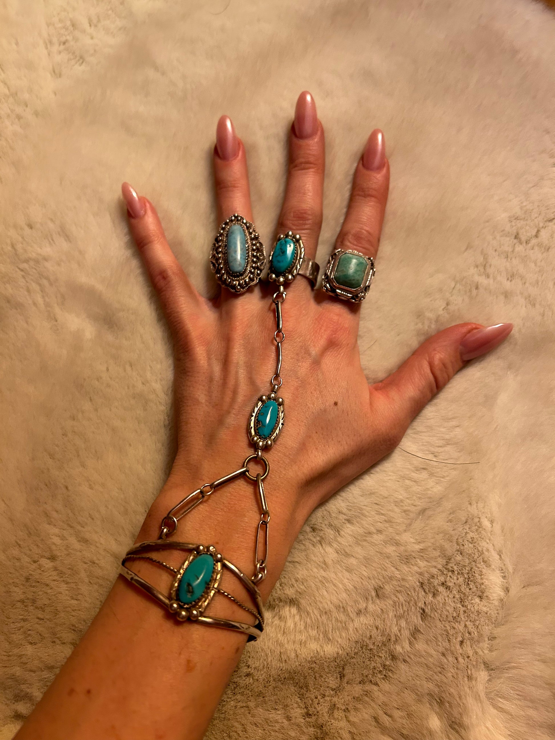 Dieses beeindruckende Navajo-Armband aus 925er Silber, kombiniert mit einem verbundenen Ring, verkörpert die traditionelle Handwerkskunst der Navajo-Kultur und strahlt eine uralte Mystik und spirituelle Kraft aus. Die leuchtenden Türkise sind kunstvoll in filigranes Silber eingefasst und verleihen dem Design eine zeitlose Eleganz und Authentizität. Mit seiner einzigartigen Form, die Armband und Ring in einem verbindet, symbolisiert dieses Schmuckstück die untrennbare Verbindung von Erde und Himmel, von Körper und Seele.